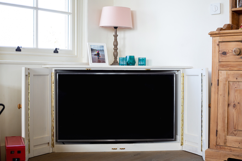 This tv cupboard is made in a corner of a room, the tv is mounted on an arm to bring it forwards out of the cupboard, it can twist left/right and be elevated. This way everyone can enjoy watching TV but it doesn’t need to be in the room when you are entertaining guests. Cupboards can be made to fit any situation.